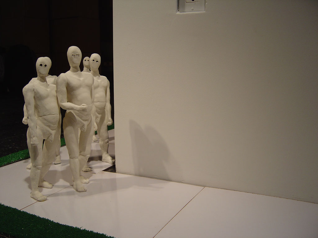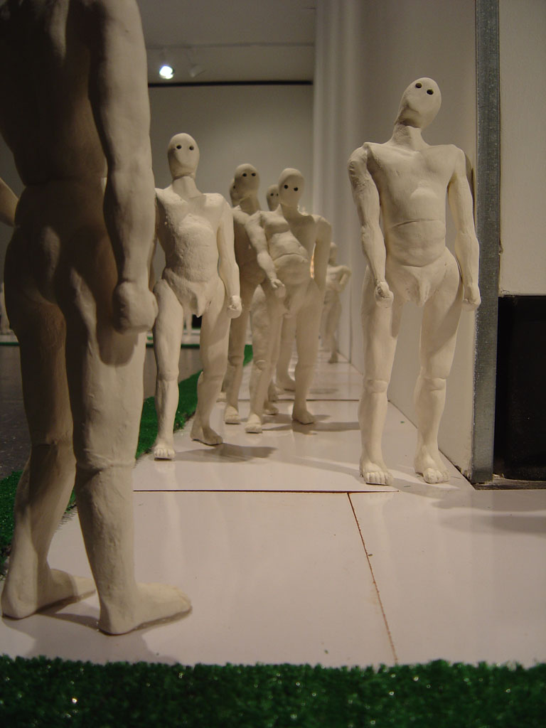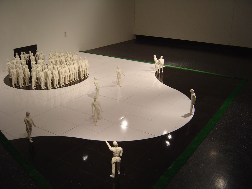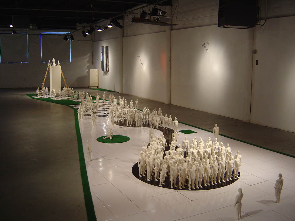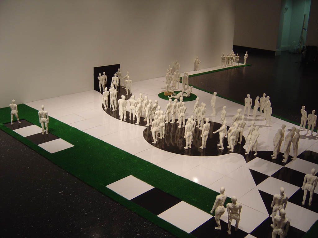 Ceramic, painted masonite tiles, digital video, wood, rye grass, plexiglass